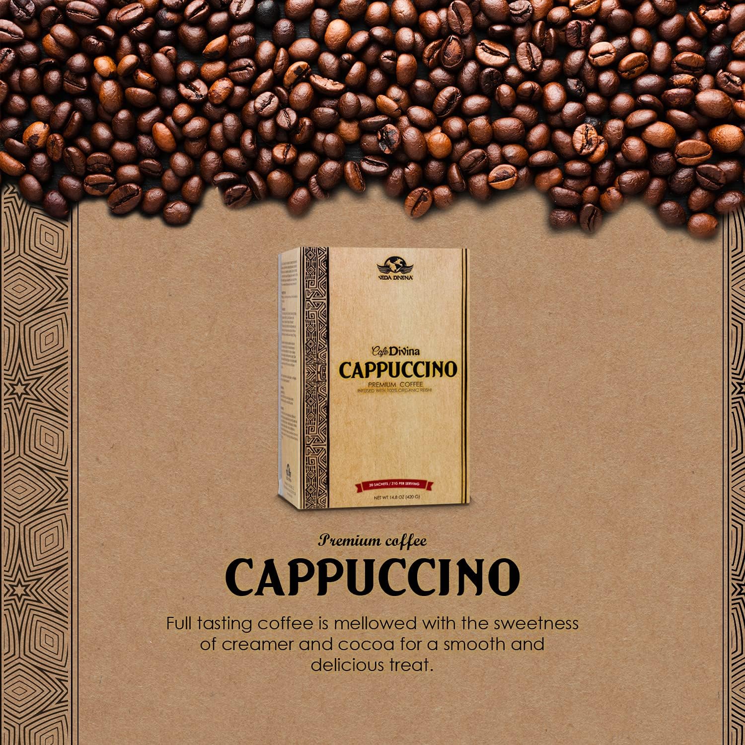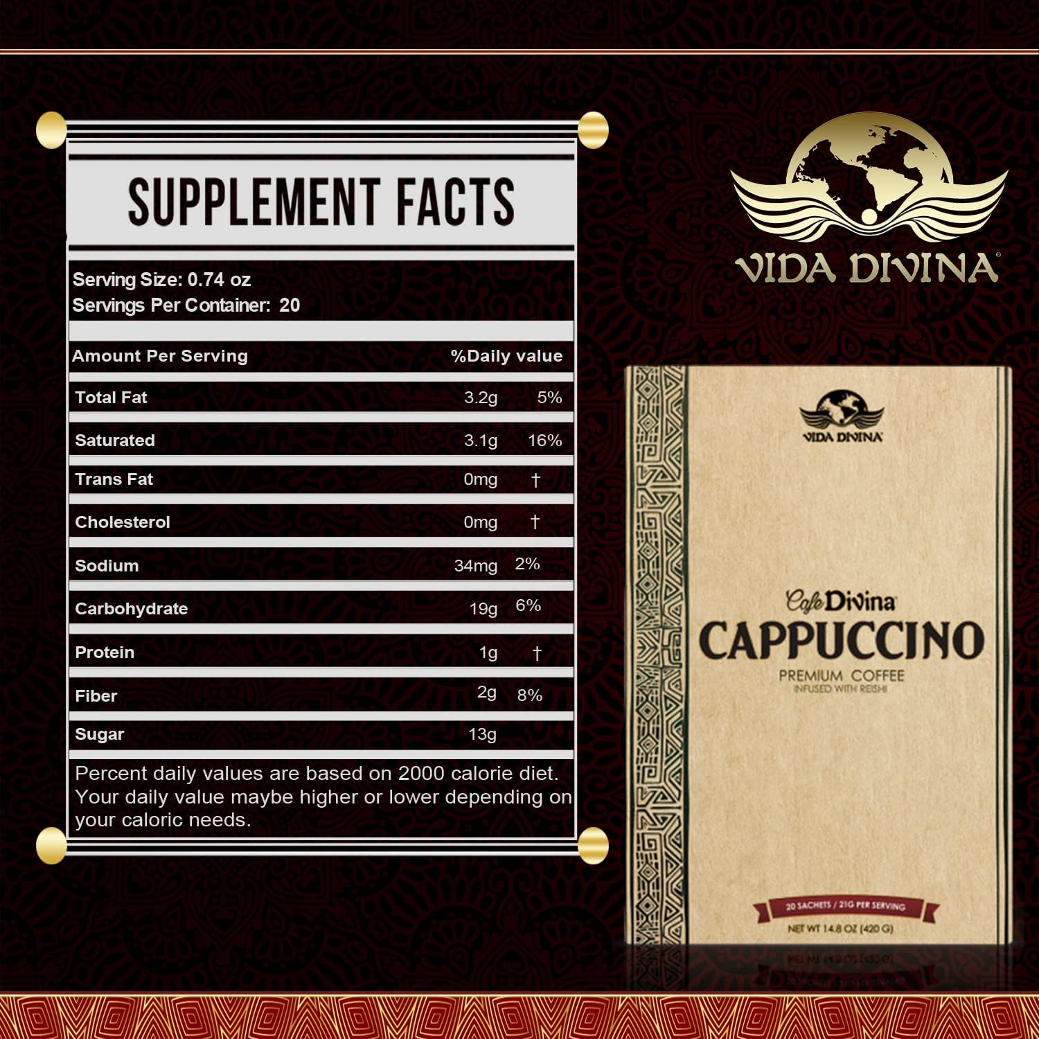 - HIGH QUALITY - Vida Divina Premium Cafe Cappuccino is Infused with 210mg of 100% Certified Organic Reishi and formulated with Organic Arabica Coffee. Each box includes 20 individual sachets.