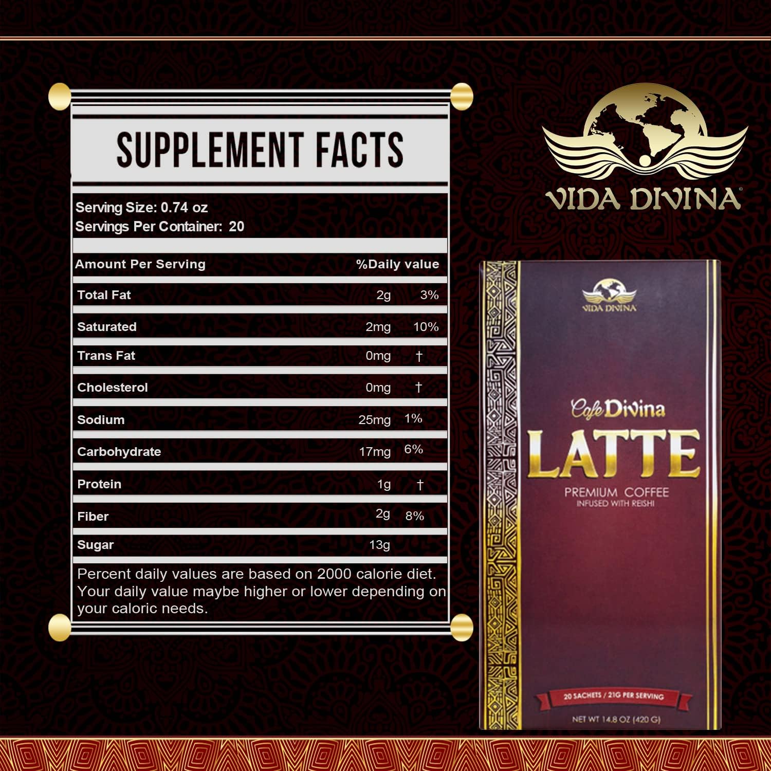 Suggested Use: Empty 1 sachet into your favorite cup, fill with hot water, stir, and enjoy! Storage: Store in a cool, dry place. Store in ambient temperatures. Ingredients: Pure Cane Sugar, Non-Dairy Creamer, Instant Organic Arabica Coffee, Reishi (210 mg). Key Ingredients: Reishi - This is a mushroom that brings a mild flavor with its own benefits containing triterpenoids, amino acids and are considered 'adaptogens'. * Non-Dairy Creamer - Adds a trace of sweetness and creamy flavor. Fiber – Each sachet has 2 grams of fiber. VIDA DIVINA® MAKES NO PRODUCT OR MEDICAL CLAIMS*This statement has not been evaluated by the Food and Drug Administration. This product is not intended to diagnose, treat, cure or prevent any disease.