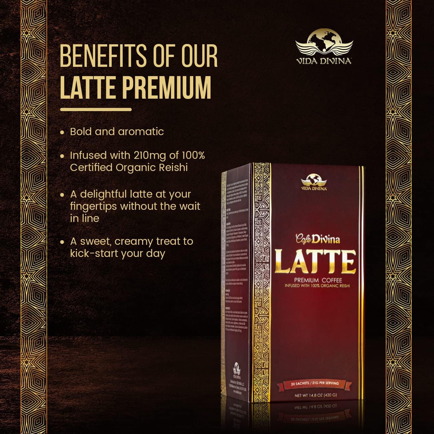 - We invite you to start your day with our creamy, delicious Latte premium coffee formulated with instant Arabica coffee beans and Reishi.